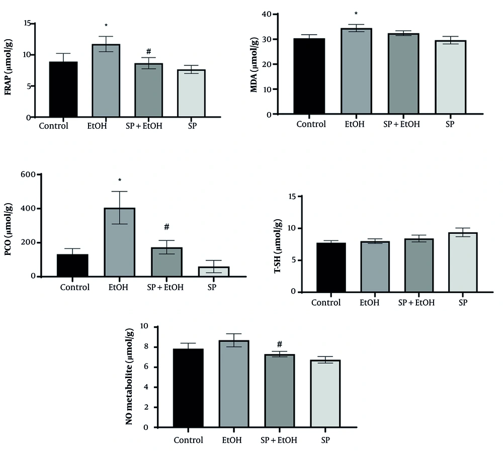 As shown in Figure 2, the EtOH group exhibited significantly higher levels of FRAP, PCO, and MDA compared to the control group (P ≤ 0.05). While NO levels increased insignificantly compared to control, S. pilifera Benth significantly reduced NO. Oral administration of 400 mg/kg S. pilifera Benth extract for 35 days significantly decreased oxidative stress markers (PCO and FRAP, P ≤ 0.05). Hepatic MDA and T-SH levels did not significantly change compared to the EtOH group.