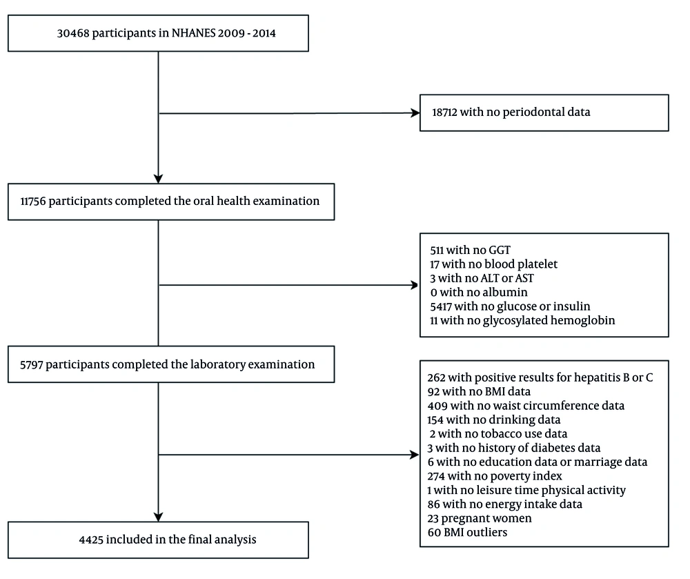 The participant selection process is detailed in Figure 2. Initially, 30,468 participants from NHANES 2009 - 2014 were considered. After excluding individuals without periodontal data, 18,712 participants remained. Subsequent exclusions were applied for missing laboratory examination data, key covariates (e.g., lifestyle factors, baseline characteristics), as well as pregnant individuals and Body Mass Index (BMI) outliers. Finally, 4,425 participants were included in the cross-sectional analysis.