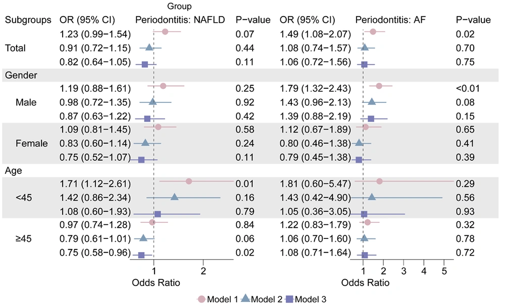 The relationship between AF and periodontitis was significant in Model 1 (OR: 1.79, 95% CI: 1.32 - 2.43) when stratified by sex, but not in the other models (P > 0.05, Figure 3).