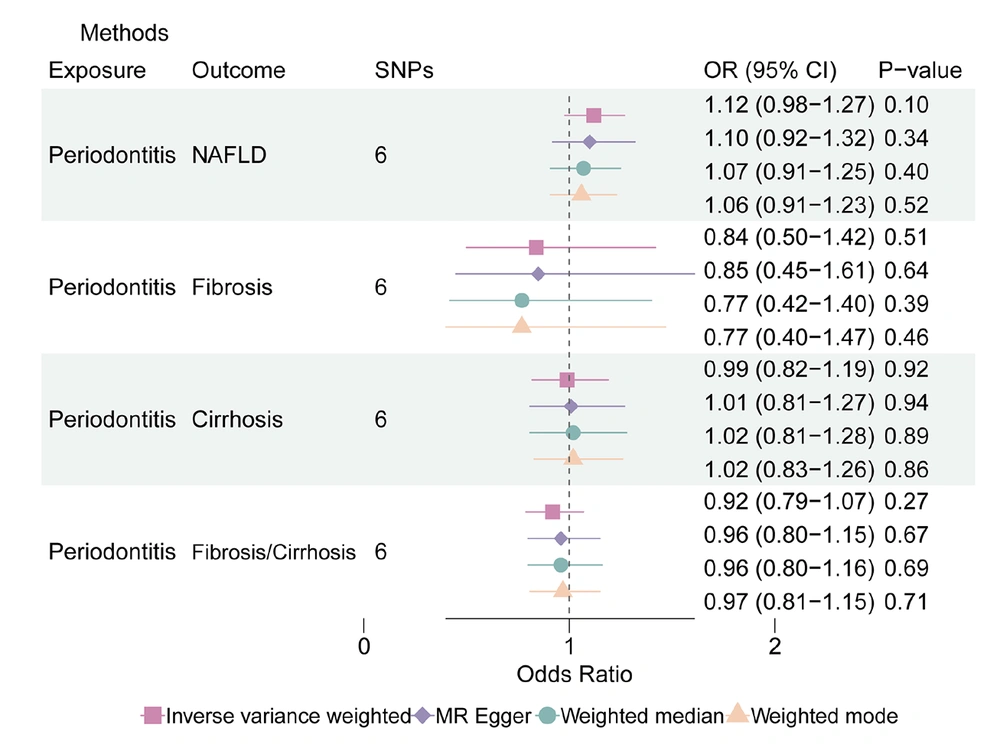 In the MR analysis where periodontitis acted as exposure, 6 SNPs were selected as instrumental variables (detailed information described in Appendix 2, in the Supplementary File). The results indicated an overall non-significant association between genetically predicted periodontitis and an increased risk of NAFLD in the IVW method (OR: 1.12, 95% CI: 0.98 - 1.27). The weighted mean (OR: 1.06, 95% CI: 0.91 - 1.23) and weighted median (OR: 1.07, 95% CI: 0.91 - 1.25) approaches further supported this conclusion. Notably, IVW validation revealed no indication of considerable SNP heterogeneity, and no pleiotropy was observed.