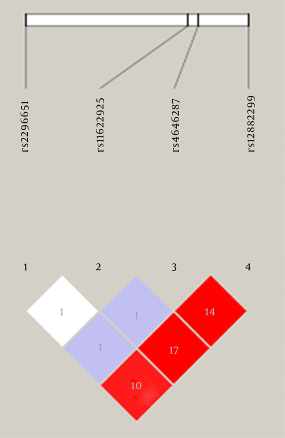 The genotype frequencies of CIITA and NTCP genes in the control subjects were confirmed to be in H - W equilibrium (P > 0.05), except for rs7404672, rs3087456, and rs11622925 in the clearance subjects and rs2296651 in the healthy subjects. LD analyses performed on all individuals from the healthy group showed that the R2 value of each pair of SNPs was less than 0.80 (Figures 1 and 2).