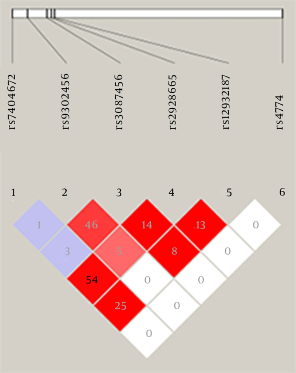 The Hard-Weinberg equilibrium of genotypes was evaluated by using Arlequin 3.5. Linkage disequilibrium (LD) was assessed by Haploview 4.2 using frequencies obtained from the healthy subjects. Odds ratios (OR) and 95% confidence intervals (CI) were calculated on the basis of the binary logistic regression analysis (adjustment for gender and age). All the statistical analyses were performed by SPSS software version 20.0 and P < 0.05 in a two sided test was considered statistically significant.