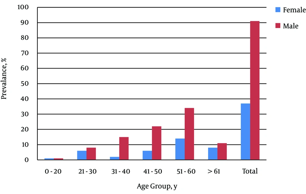 The sample size was an excellent representation for HCV population in Bahrain as 128 patients were included in this study of 237 Bahraini HCV patients recorded in Bahrain during the study period; therefore, the sample size represents 54% of the total number of HCV positive patients in Bahrain. The overall prevalence of HCV in Bahrain during the study period was 0.99% (32). HCV prevalence among male patients was 71.1%, while it was 28.9% among females. This higher prevalence among males may reflect risk factors related to male activities. Besides, the average age of males was higher than that of females, which may explain the different prevalence. The prevalence of HCV infection showed an increase with age, as the highest incidence was shown for the age group 51 - 60, which is explained by increased exposure with age.