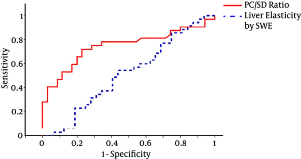 In the recent years, additional roles for ultrasound-based techniques beyond the initial purpose of a non-invasive detection of significant fibrosis and early stage cirrhosis, have included non-invasive prediction of PHT and its consequences. The TE has been extensively studied in this context, but less data exists for the utility of Real-Time Elastography techniques like SWE, which deserves more attention. The SWE could be incorporated in widely available conventional US device, thus could permit the risk estimation simultaneously at the time of cirrhosis diagnosis or during the HCC surveillance. Thus, an SWE-based high-risk varix prediction model could be advantageous regarding economic benefits, patient acceptance, and medical burden. However, the current study revealed that accuracy with the ROC model of elasticity for the prediction of high-risk OV (≥ grade II) for Child-Pugh class A cirrhotic patients was poor, and significantly inferior than that of the simple PC/SD ratio (0.514 vs 0.748, P = 0.025). Also, elasticity values were not only non-indicative of variceal size, but also were not correlated with the Child-Pugh scores, which reflect the liver synthetic function as well as hemodynamic consequences of cirrhosis. Regarding the PC/SD ratio, this research found a weak but significant negative correlation (rs = -0.205, P = 0.042) between the PC/SD ratio and Child-Pugh score. Consistent with the SWE results, in a recent prospective study including 79 Child-Pugh A - C patients, both SWE and TE techniques demonstrated poor diagnostic accuracies (AUROC 0.600, and 0.630, respectively) for high-risk OV presence (8), despite the high diagnostic accuracies by SWE or TE for detection of CSPH diagnosed by means of Hepatic Venous Pressure Gradient (HPVG) (AUROC 0.870 and 0.780, respectively) (8). Likewise, several studies have demonstrated a good correlation between liver stiffness (1) values and HVPG (17-20), yet there are contradictory results with regards to the size of OVs. Some studies reported a correlation between LS values and size of the OVs (21), while others could not show such correlation (8, 20). A recent meta-analysis (22) stated that LS by TE was limited in specificity and PPV with wide range of performance and cut-off values, precluding its use to replace UGIE for large OV detection. Even though good correlations have been reported between LS and CSPH, LS measurements may not be good enough at predicting high-risk OVs. Two studies (20, 23) stated important findings on the relationship between LS and CSPH, to explain this contradiction. Strong correlation coefficient existed between LS by TE and HVPG values < 12 mmHg, while correlation coefficient dropped to a suboptimal level for HPVG values of ≥ 12 mmHg, which is the threshold for variceal formation and hemorrhage (20, 23). They explained this by the fact that mechanisms of PHT become less dependent on the intra-hepatic vascular resistance caused by accumulation of fibrous tissue (as reflected by an increase in LS) above a degree of HPVG, while complex hemodynamic changes (e.g. hyper-dynamic circulation and splanchnic vasodilatation) contribute to the increase in portal pressure that are not assessed by the means of LS (20, 23). Accordingly, at higher HPVG levels (where larger OV and hemorrhage risk increases), LS may not be an ideal non-invasive surrogate of HVPG, and, thus, its direct consequence OVs.