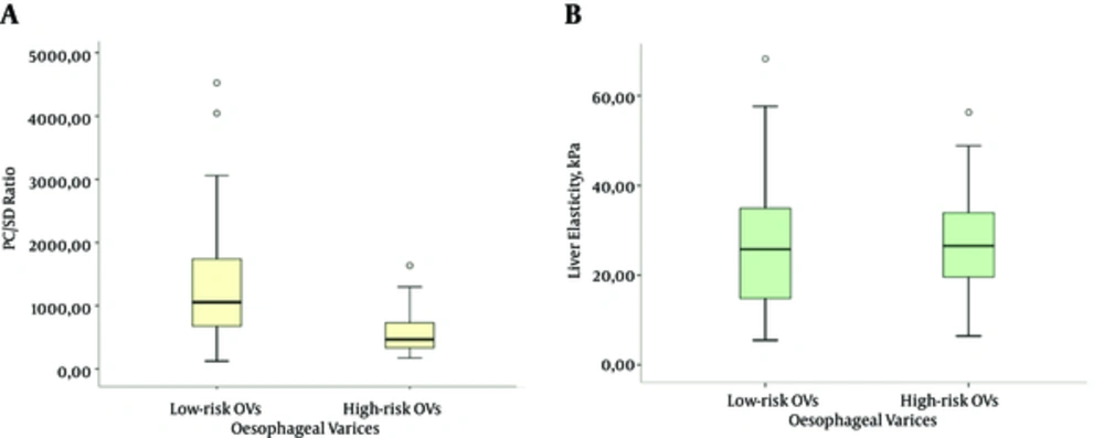 Considerable interest has been directed to develop non-invasive models to predict Clinically Significant PHT (CSPH), OVs, and variceal hemorrhage risk. Researchers have investigated different prediction models by using laboratory or Ultrasound (US) parameters, such as Platelet (PLT) count, Aspartate Transaminase (AST) to PLT Ratio Index (APRI), Fibrotest, spleen size, portal vein diameter, And Transient Elastography (TE). However, no consensus exists with regards to an optimal measure. Shear-Wave Elastography (SWE) is a relatively new modality, which has some advantages with respect to TE: It has the advantage of displaying a quantitative map of liver elasticity on a color-coded image superimposed on real-time B-mode images (6, 7). The elasticity acquisitions can be performed by the visual control of the operator, avoiding measurements from the interfering structures like kidneys or in nearby vessels. Preliminary results suggest that SWE is at least as good as TE for diagnosis of clinically significant fibrosis, and may have higher applicability in challenging cases of obesity and ascites (8-10), yet there is limited data on the issue of non-invasive prediction of high-risk OVs, based on SWE values. Since SWE could be implemented into a regular US imaging device, it would bring no additional burden when simultaneously assessed during the recommended Hepatocellular Carcinoma (HCC) US surveillance. One other non-invasive means is the Platelet Count (PC)/Spleen Diameter (SD) ratio (PC/SD) based on a regular laboratory result and an imaging parameter, which are already available for cirrhotic patients. Since an initial report in 2003 by Giannini et al. (11), a number of studies have investigated the accuracy of PC/SD linking to the presence of OVs in cirrhotic patients (12-15).