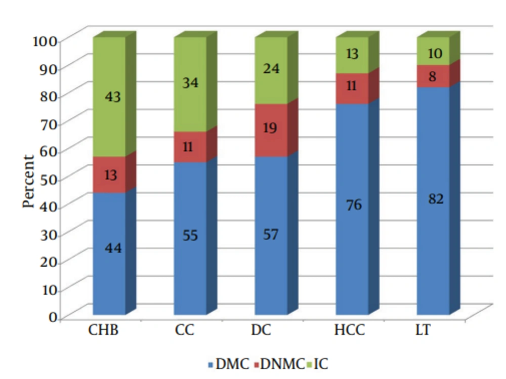 In this study, 280 patients at different stages of the disease (130 patients with CHB, 56 with CC, 71 with DC, and 23 with HCC) were enrolled. Table 1 briefly presents the descriptive results, classified by the stages of the disease based on sex, education, occupational status, and the mean age of the patients. According to Table 1, the mean age of the entire sample in all states of the disease was 47 years (range, 43.45 - 54.7 years) and 70% of the patients were male.