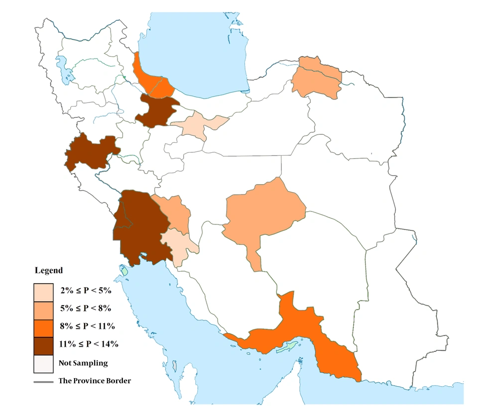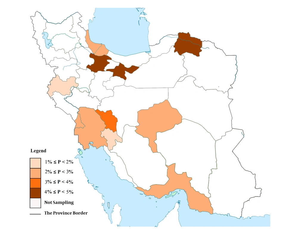 The prevalence of HCV in Iranian prisons was 8.21% (95% CI: 7.55 - 8.90). This estimation was significantly different in 10 provinces: from 2.92% to 13.22% (P < 0.001) (Figure 1). The prevalence of HBV in this study was 3.06% (95% CI: 2.65 - 3.50). This value was significantly different in the studied provinces: from 1.74% to 4.83% (P = 0.003) (Figure 2).