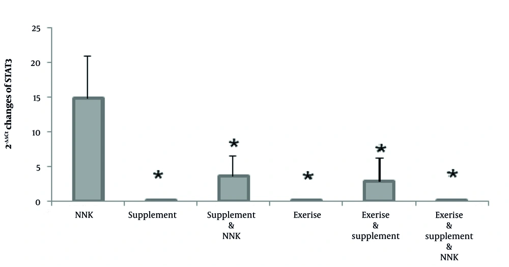 ![Average expression levels of the STAT3 gene in research groups [values are based on mean ± SD; * significant level at P < 0.05 compared with nicotine-derived nitrosamine ketone (NNK)]. Average expression levels of the STAT3 gene in research groups [values are based on mean ± SD; * significant level at P < 0.05 compared with nicotine-derived nitrosamine ketone (NNK)].](https://services.brieflands.com/cdn/serve/31710/ae9283252a37cb56b55a3fcac022196a9ec9238d/ijcm-18-1-163669-i001-preview.webp)