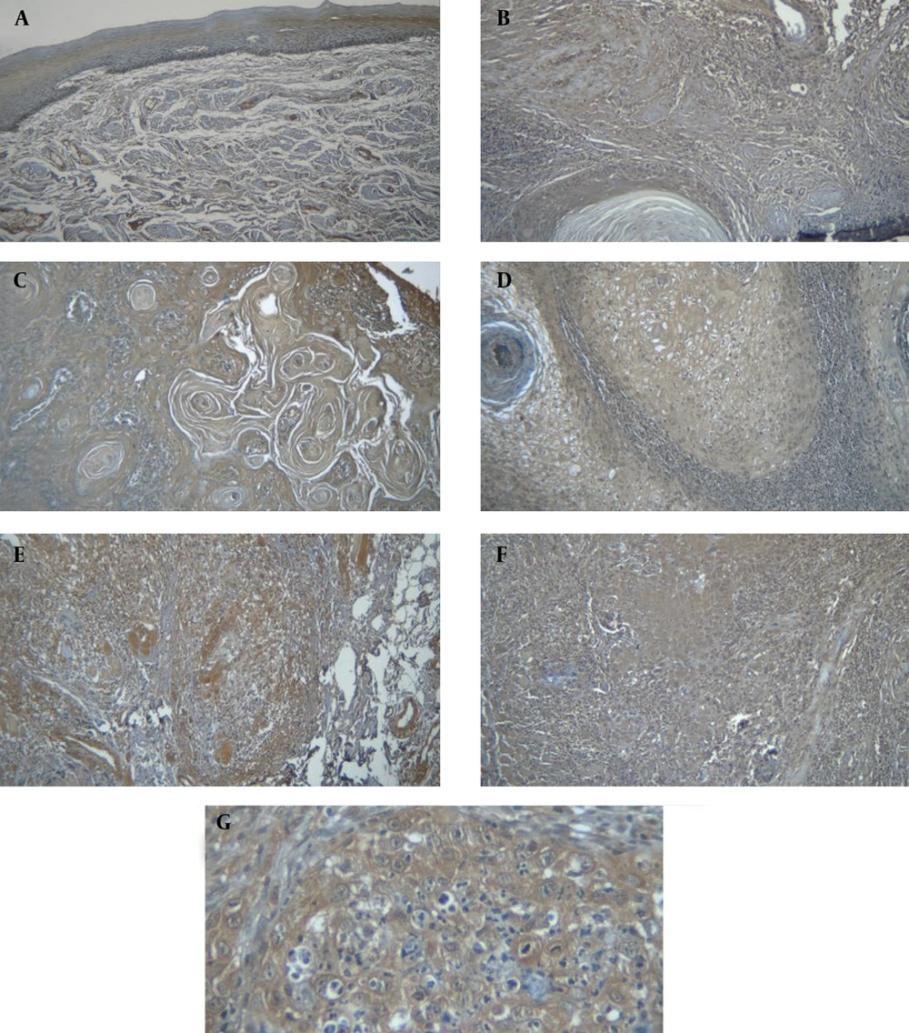 A, normal epithelium showing no expression of sonic hedgehog (SHH) in the cytoplasm and nucleolus (magnification 200×); B, negative SHH expression in tongue squamous cell carcinoma (TSCC) I - (magnification 200×); C, positive SHH expression in TSCC I: Negative nuclear expression – mild cytoplasmic expression – magnification 200×); D, SHH expression in TSCC II: Negative nuclear expression – Mild cytoplasmic expression (magnification 200×); E, SHH expression in TSCC II: Negative nuclear expression – mild cytoplasmic expression (magnification 200×); F, SHH expression in TSCC III showing mild nuclear expression and strong cytoplasmic expression (magnification 200×); G, SHH expression in TSCC III demonstrating negative nuclear expression and moderate cytoplasmic expression (magnification 400×).