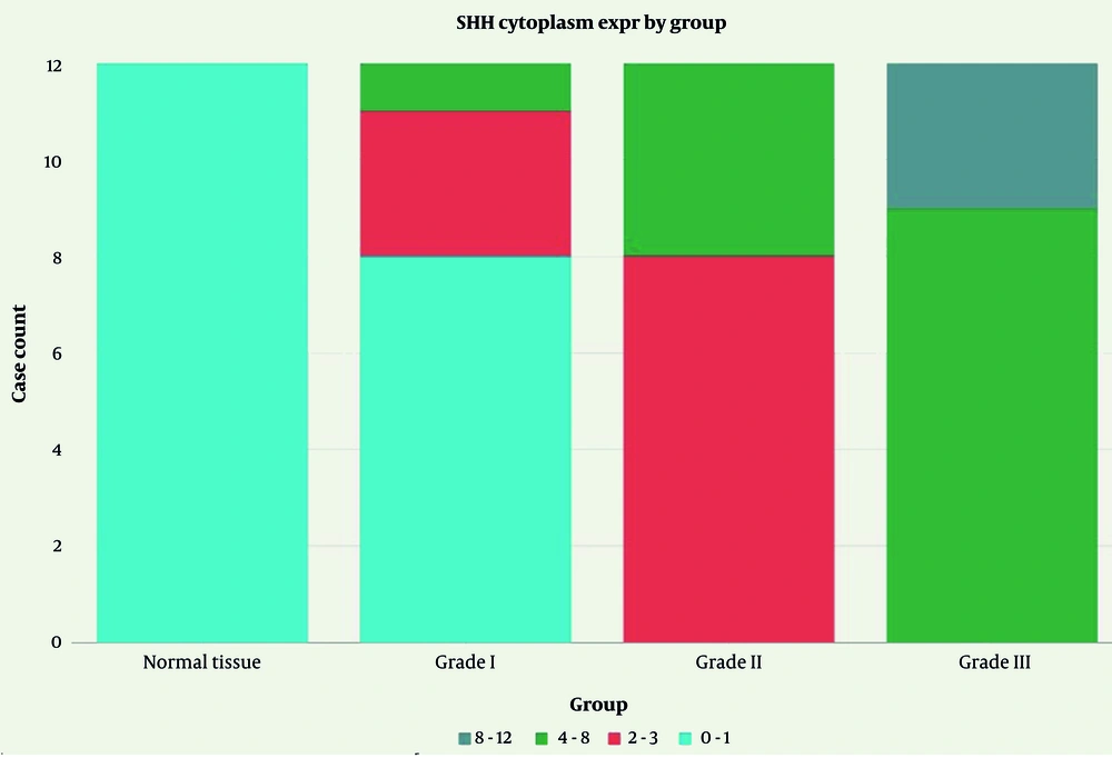 Statistical analysis revealed highly significant differences among groups (χ2 = 37.71, P < 0.001; Table 4). The following graph shows the distribution of SHH cytoplasmic expression levels across normal tissue and tumor grades (Figure 2).