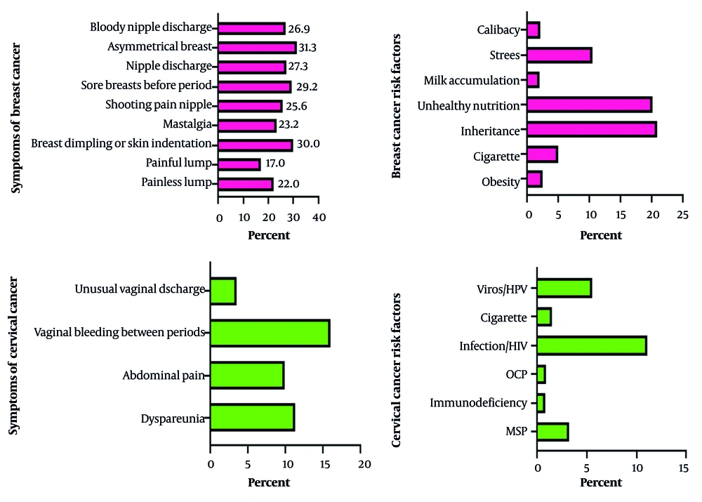 Given that cancer has caused major problems worldwide (5), awareness of its risk factors, symptoms, and screening programs remains insufficient in many populations. Public knowledge about cancer plays a pivotal role in promoting early detection and prevention, as individuals who are aware of their risk factors are more likely to adopt healthier behaviors and participate in screening programs. Enhancing public knowledge about various types of cancer can encourage individuals to adopt health-promoting behaviors, ultimately reducing cancer-related morbidity and mortality (6-8). Perception of risk factors for cancer, individuals can make lifestyle adjustments or undergo screening tests to detect cancer at an early stage. Successful early diagnosis of cancer heavily relies on individuals’ knowledge of its warning signs (9-11). Additionally, recognizing these warning signs and taking proactive measures, such as undergoing diagnostic tests, can prevent cancer from advancing to severe stages (9). Therefore, assessing public knowledge about cancer warning signs and identifying factors that influence this awareness are essential for guiding health initiatives aimed at controlling and preventing cancer at the community level (9, 12, 13).