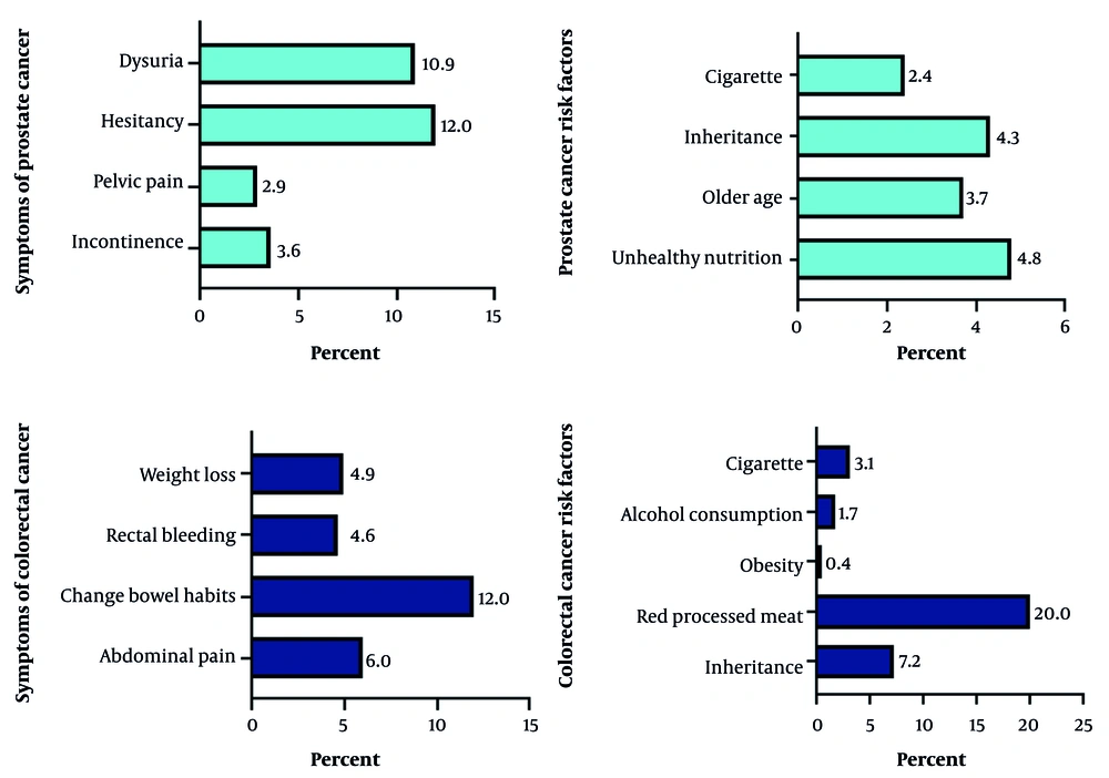 Considering that the most common types of cancers are breast cancer (BC), with 2.2 million cases; colorectal cancer (CRC), with 1.9 million cases; prostate cancer (PC), with 1.4 million cases; and cervical cancer (CC), with 0.6 million cases worldwide (7). Studies have shown that a lack of awareness about cancer is associated with delayed diagnoses and poorer outcomes, particularly in low- and middle-income countries, especially in Iran, where public health education is often limited (14, 15).