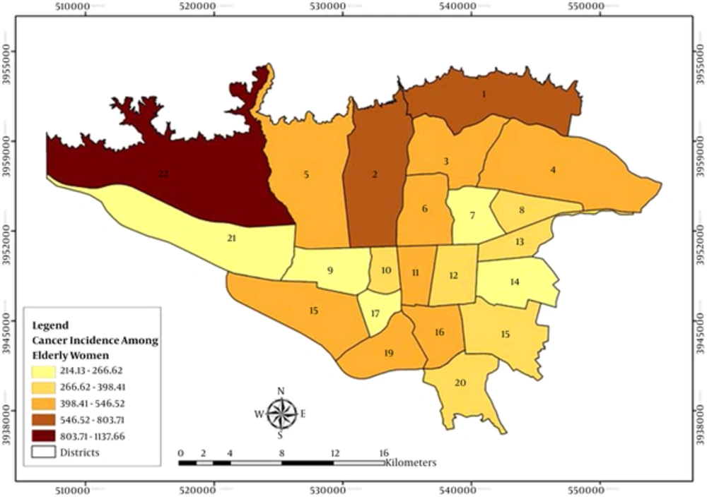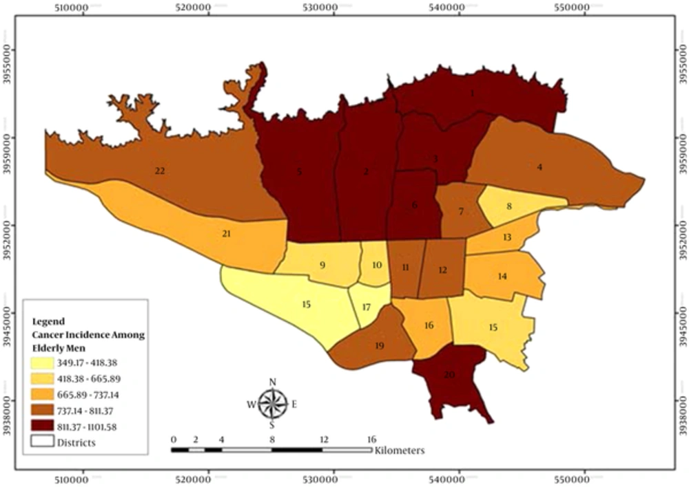 Geographic Information System (GIS) and spatial analysis have provided new opportunities for the policymakers to investigate the relationship between health and environmental risk factors or the geographic characteristics (9-14). Spatial analysis allows us to identify the patterns, and classify data as regular, random, or clustered (15). Spatial autocorrelation is used to assess the rates, and Moran’s I is one of the best statistical measures that is similar to the Pearson’s correlation coefficient. The I statistic measures the covariation between the rates of adjacent regions (16, 17). The current study aimed to examine cancer incidence rates in those over 65 years of age living in Tehran, conduct cluster and Outlier analysis, to learn about disparities across the 22 districts of Tehran and to find common cancer types among the elderly in this mega city.