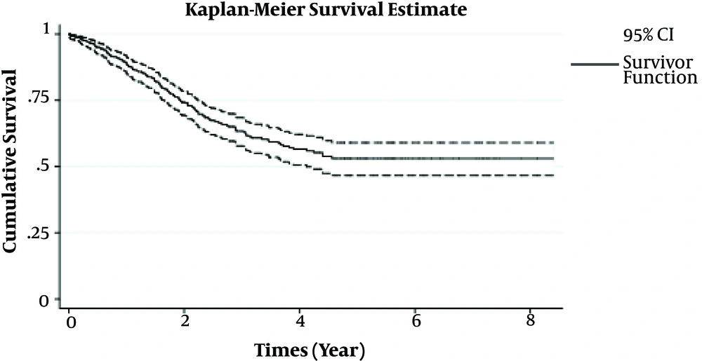 In survival analysis, it is usually assumed that all individuals gradually experienced the event of interest until the end of the observation period (22). In some situations, a substantial proportion of individuals do not experience the event under the study at the end of follow-up time (21). Under this circumstance, the population consists of two groups: the group of individuals who do not experience the event of interest (or long-term survivors) and the group of patients who are susceptible (or non-cured) to the disease (23). In such a situation, standard survival analysis is not a proper method because of increases in a number of censoring at the end of the follow-up period, which does not account for the possibility of long-term survivors (21). In order to confirm that a considerable number of cases do not eventually experience the event of interest until the end of the follow-up time, the Kaplan-Meier survival plot can be a useful tool to reveal whether the plot reached zero with the current amount of follow-up time; so, a significant number of cases is cured and also it appears that there is a considerable cure fraction in dataset (24). In the case of high cure fraction, Cox regression model will lead to bias estimates. Cure models allow us to build a model, which can determine risk factors which have had a significant effect on survival of cured and uncured patients (24). Since a proportion of individuals will survive from the event of interest, a cure rate model can be an appropriate and useful method to estimate cure fraction and model the rate of cured people directly (21). Cure models are categorized in two different major groups: The mixture and non-mixture cure fraction models. Non-mixture cure model or bounded cumulative hazard model are utilized to model both group, cure fraction, and survival parts of the model by specific approaches (25). The primary advantage of the non-mixture model is due to the fact that the proportional hazard assumption is held in this model. Moreover, according to recent studies, it has a biological interpretation. Indeed, in cancer-based studies, the survival time is defined as the result of a latent process, which is generating cancer tumors. Therefore, in the current study, the non-mixture cure rate model is used rather than the mixture cure rate model (26, 27).