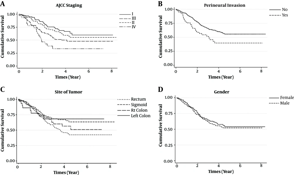 In the current study, factors such as the site of the tumor, gender, perineural invasion, AJCC staging, lymph node ratio, age at diagnosis, and size of the tumor were determined as risk factors for colorectal cancer. In our study, approximately half of patients with CRC lived after a relatively long survival time.