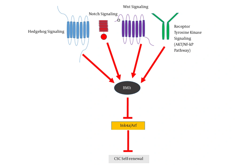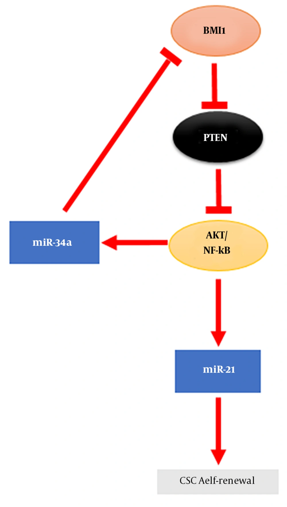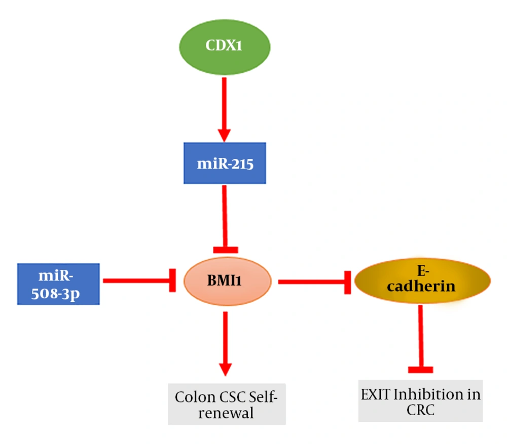 BMI1 is a key regulator of CSC self-renewal and plasticity (6) and resides downstream of several signaling pathways such as wnt/β-catenin, notch, and hedgehog, which play important roles in maintaining the growth, proliferation, and functional integrity of CSC (7). Since BMI1 is overexpressed in many cancer types, including CRC (8) and plays an essential role in stem cell self-renewal and survival; it stands out as a promising target for controlling CSC function (9). The miRNAs are small endogenous non-coding RNAs that play important roles in normal and cancer stem cells (10). The overexpression of BMI1, as a result of deregulated miRNAs, could result to cancer progression and metastasis. The present review summarized some functions of BMI1 in CSCs, especially colon CSCs, with an overview of miRNA regulation of BMI1 in different types of cancer.