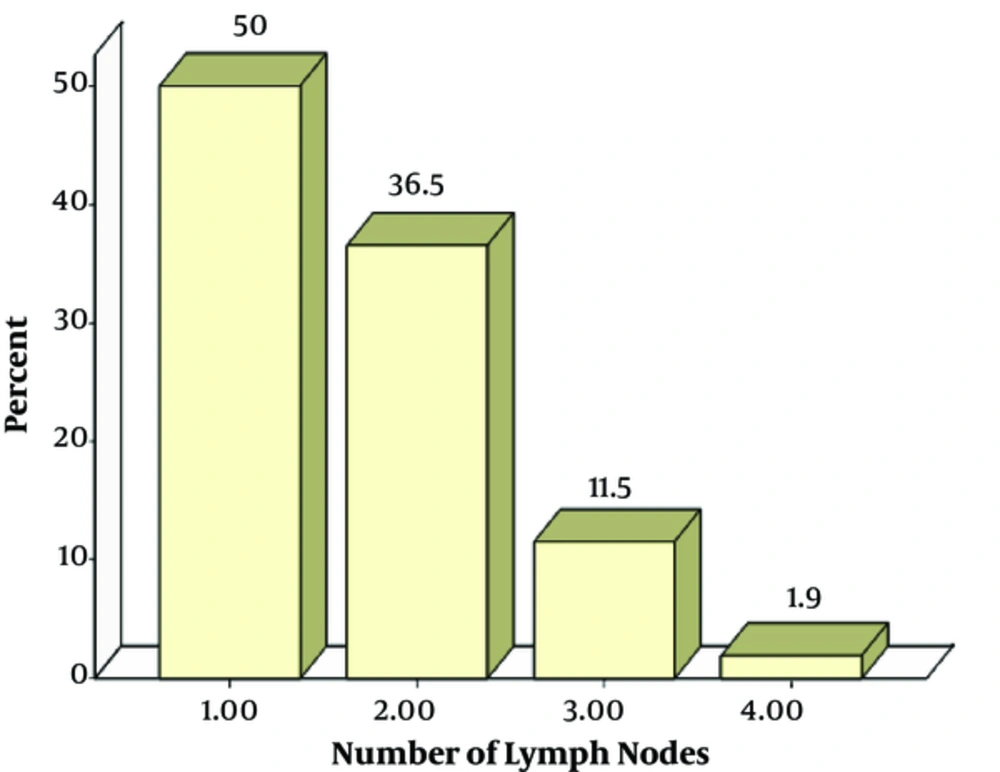 The mean number of lymph nodes removed was 1.65 ± 0.76 (26 patients with 1 node, 19 with 2 node, 6 with 3 nodes, and 1 patient with 4 nodes. The bar chart is shown in graph 1.