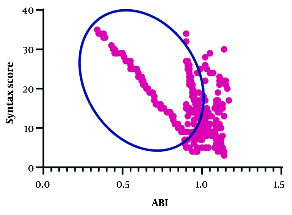 Our finding of a strong inverse correlation between ABI and SYNTAX score is consistent with numerous previous reports. Several studies have demonstrated that low ABI (typically ≤ 0.90) is associated with greater severity and complexity of CAD, including higher SYNTAX scores (16-18). The biological plausibility is clear: Reduced ABI reflects increased systemic atherosclerotic burden and PAD, which frequently coexists with more extensive coronary involvement (19). In diabetic populations, chronic hyperglycemia accelerates endothelial dysfunction, inflammation, and atherosclerotic progression, further strengthening this relationship (16, 20).