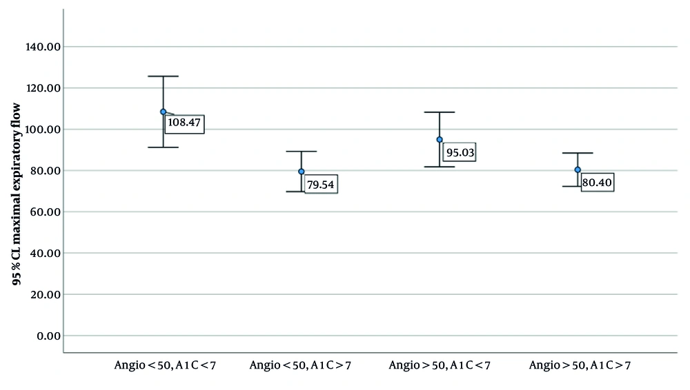 Table 3 and Figure 1 present the comparison of MEF among diabetic patients categorized based on the severity of coronary artery involvement (< 50% vs. > 50%) and glycemic control status (A1C < 7 vs. A1C > 7). The results of the one-way ANOVA indicate a statistically significant difference in MEF across the groups (P = 0.017). Post-hoc pairwise comparisons revealed that patients with less than 50% coronary involvement and good glycemic control (A1C < 7) had significantly higher MEF values compared to those with poor glycemic control (A1C > 7), regardless of the degree of coronary involvement. Notably, MEF was highest in the group with both mild coronary involvement and well-controlled diabetes. These findings suggest a possible interaction between glycemic status and vascular involvement in determining pulmonary function in diabetic individuals.