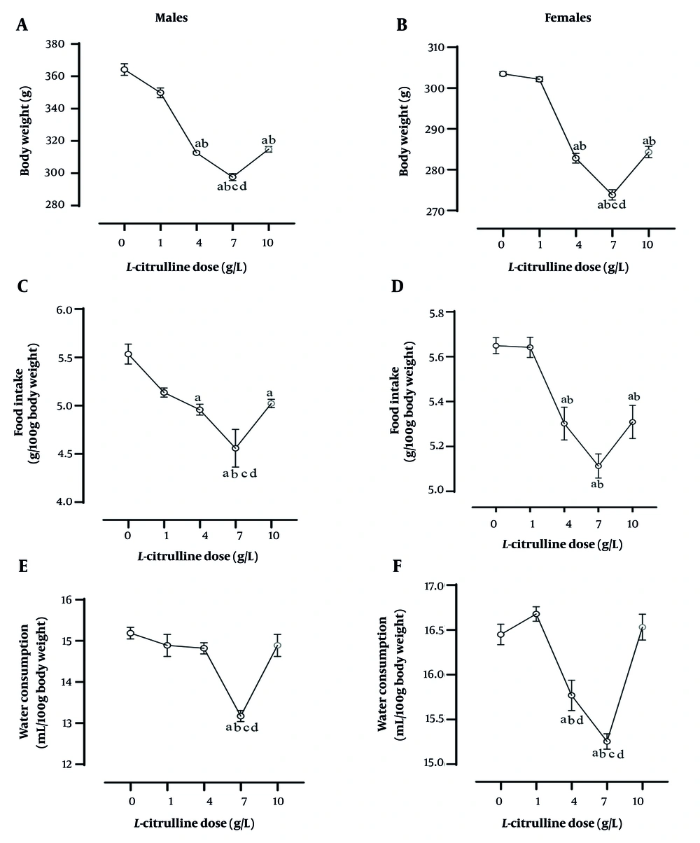 ![Dose-dependent effect of L-citrulline (Cit) on A and B, body weight; C and D, food intake; and E and F, water consumption at the end of the study (week 8) in male and female rats with type 2 diabetes [T2D; values are mean ± standard error of the mean (SEM); n = 6/group; a, b, c, and d, statistically significant differences in comparison to the doses of 0, 1, 4, and 10 g/L Cit, respectively]. Dose-dependent effect of L-citrulline (Cit) on A and B, body weight; C and D, food intake; and E and F, water consumption at the end of the study (week 8) in male and female rats with type 2 diabetes [T2D; values are mean ± standard error of the mean (SEM); n = 6/group; a, b, c, and d, statistically significant differences in comparison to the doses of 0, 1, 4, and 10 g/L Cit, respectively].](https://services.brieflands.com/cdn/serve/3170f/09aa12b7a66ba7f1517b2957ef08876fc88112b1/ijem-23-3-162367-i004-preview.webp)