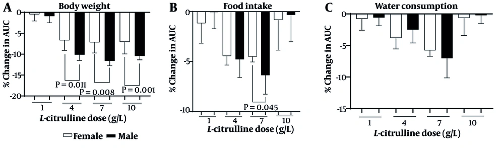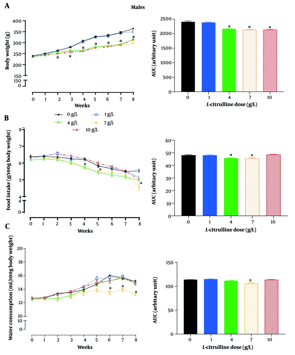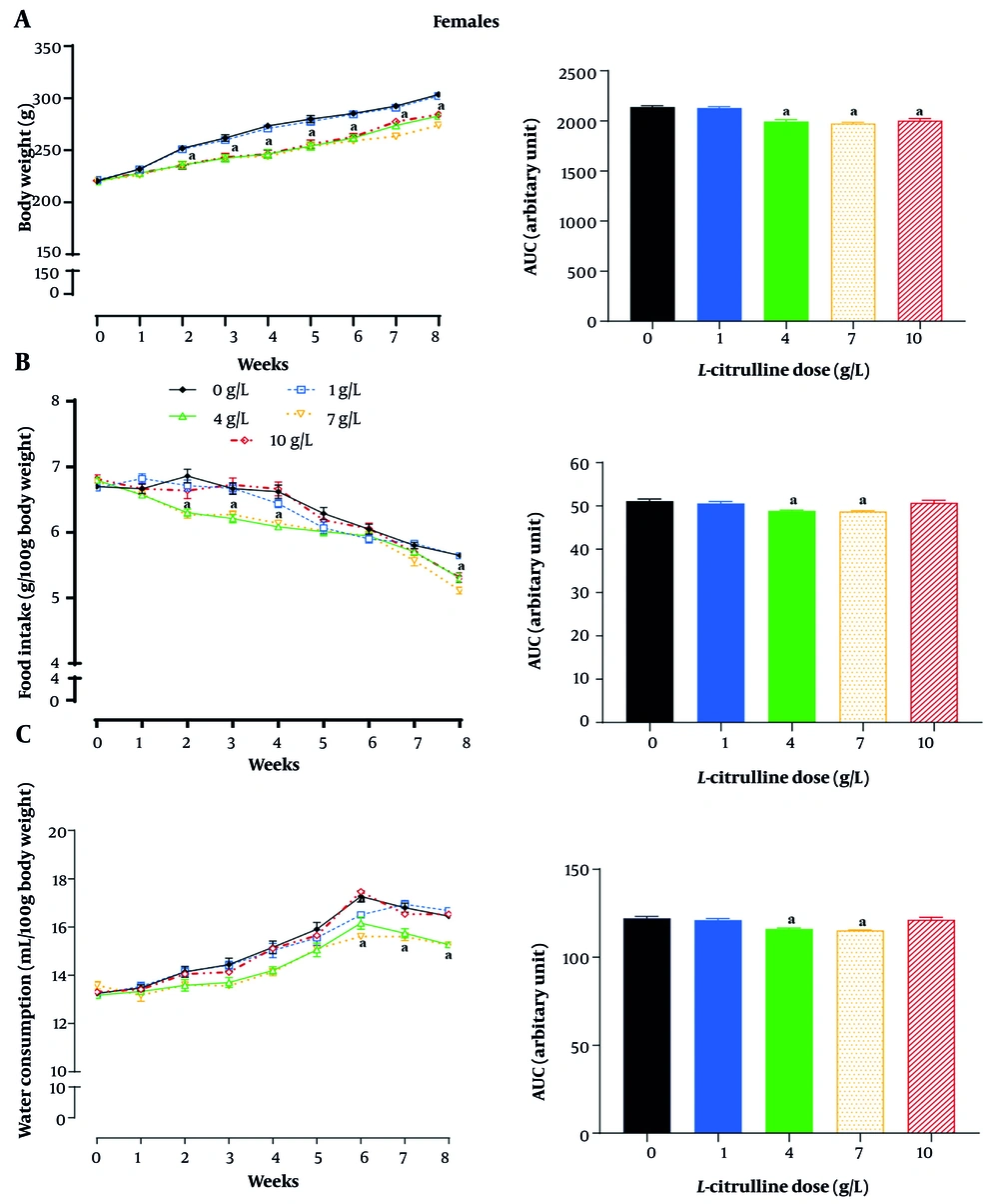 ![Effect of different doses of L-citrulline (Cit) on A, body weight; B, food intake; and C, water consumption in female rats with type 2 diabetes [T2D; values are mean ± standard error of the mean (SEM); n = 6/group; a, statistically significant difference in comparison to the doses of 0 g/L Cit; abbreviation: AUC, area under the curve]. Effect of different doses of L-citrulline (Cit) on A, body weight; B, food intake; and C, water consumption in female rats with type 2 diabetes [T2D; values are mean ± standard error of the mean (SEM); n = 6/group; a, statistically significant difference in comparison to the doses of 0 g/L Cit; abbreviation: AUC, area under the curve].](https://services.brieflands.com/cdn/serve/3170f/95cff997810daf6728e52ccc9c34b7dbb3f6f375/ijem-23-3-162367-i005-preview.webp)