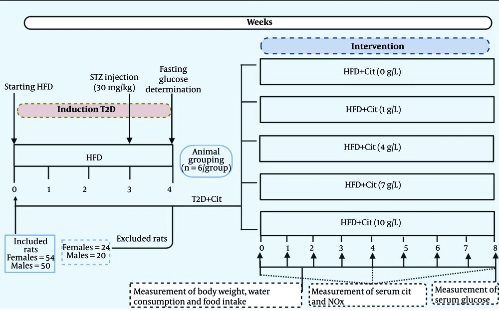 After verifying the induction of the T2D model, female and male T2D rats were randomly (Appendix 1 in Supplementary File) divided into 5 groups (n = 6/group) that received Cit at doses of 0, 1, 4, 7, and 10 g/L in drinking water for 8 weeks, respectively. The rationale behind selecting these doses was that Cit has been used in doses ranging from 2.7 to 15 g/day (40 - 215 mg/kg/day in a 70-kg human) in humans (8), and it has been proposed that doses of 3 - 10 g/day (43 - 143 mg/kg/day in a 70-kg human) are most effective for cardiometabolic disorders (27). When translated to rats, the doses of 43 - 143 mg/kg/day in humans (rat dose = human dose/0.162) (28), yielded doses of 265 and 882 mg/kg in rats, respectively. Considering the initial body weight of animals (~ 250 g) and the average value of water intake in rats (30 mL/day) (29), doses of Cit that have been used in this study (1, 4, 7, and 10 g/L in drinking water) correspond to 120, 480, 840, and 1200 mg/kg, which cover the intended doses.