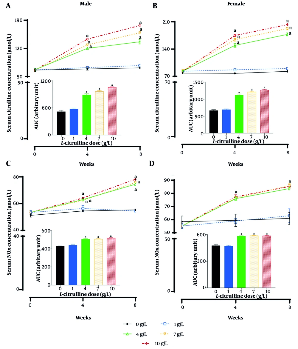 ![Effect of different doses of L-citrulline (Cit) on A and B, the serum Cit and nitrite+nitrate (NOx, C and D) levels in male and female rats with type 2 diabetes [T2D; values are mean ± standard error of the mean (SEM); n = 6/group; a, statistically significant difference in comparison to the dose of 0 g/L Cit; abbreviation: AUC, area under the curve]. Effect of different doses of L-citrulline (Cit) on A and B, the serum Cit and nitrite+nitrate (NOx, C and D) levels in male and female rats with type 2 diabetes [T2D; values are mean ± standard error of the mean (SEM); n = 6/group; a, statistically significant difference in comparison to the dose of 0 g/L Cit; abbreviation: AUC, area under the curve].](https://services.brieflands.com/cdn/serve/3170f/37159186ce97bd51254eceee5872c92854e36681/ijem-23-3-162367-i002-preview.webp)