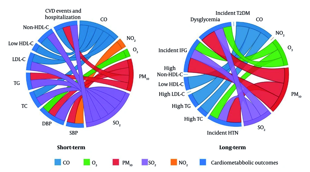 Five TLGS papers (2019 - 2025) met inclusion criteria. Two cardiovascular-event studies analyze TLGS Phase 1 recruits from 1999 (15, 16), while three risk-factor studies start in Phase 2 from 2001 and follow participants through Phase 6. Sample sizes range from roughly 3,500 to 9,700 adults. Four papers model short-term (0 - 14-day) lags, three examine long-term (1- to 3-year) averages, and two cover both. All rely on identical city-wide metrics for PM₁₀, SO₂, NO₂, O₃, and CO. Outcomes span continuous blood pressure and incident HTN, longitudinal serum lipids and dyslipidemia, incident dysglycemia/diabetes, adjudicated fatal and non-fatal cardiovascular events and hospitalizations, and all-cause/cause-specific mortality. Study characteristics are summarized in Table 1. The distribution of air pollutants during 1999 - 2018 (15) is shown in Table 2, and associations between pollutants and outcomes are presented in a matrix in Figure 1. Moreover, a chord diagram of positive short- and long-term associations between pollutants and cardiometabolic outcomes are presented in Figure 2A and 2B, respectively.