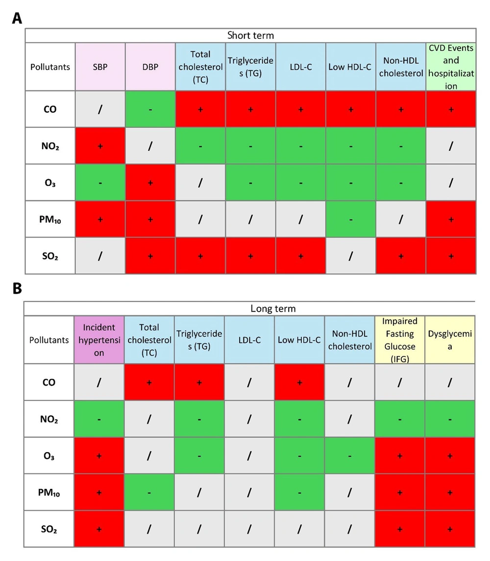 Matrix of associations between ambient air pollutants and cardiometabolic health outcomes in the short-term and long-term; short-term (A), and long-term (B) associations between ambient air pollutants (CO, NO₂, O₃, PM₁₀, and SO₂) and various cardiometabolic health outcomes, including blood pressure (SBP, DBP), lipid profiles (total cholesterol, triglycerides, LDL-C, HDL-C, non-HDL cholesterol), and cardiovascular events and hospitalization. Positive (+) and negative (-) associations are indicated in green and red, respectively. Neutral/no association is marked in gray (abbreviations: CO, carbon monoxide; NO₂, nitrogen dioxide; O₃, ozone; PM₁₀, particulate matter ≤ 10 µm in diameter; SO₂, sulfur dioxide; SBP, systolic blood pressure; DBP, diastolic blood pressure; LDL-C, low-density lipoprotein cholesterol; HDL-C, high-density lipoprotein cholesterol; non-HDL, non-high-density lipoprotein).