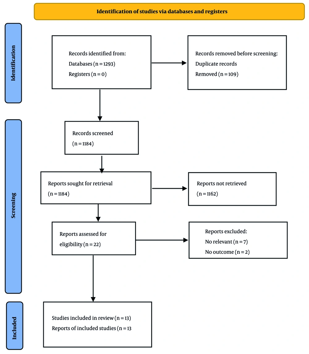 Figure 1 shows the flowchart of the included studies. We identified 1,293 eligible papers by our initial search in electronic databases, including PubMed/Medline (n = 73), Scopus (n = 1,118), and Web of Science (n = 102). One hundred nine papers were eliminated due to duplicate publication, and 1,184 papers were assessed. We excluded 1,162 papers based on their titles and abstracts, and 22 papers were evaluated for further information. Among them, seven irrelevant papers were excluded (20-26), and two were removed due to a lack of outcomes of interest (27, 28). Finally, 13 papers were included in the present systematic review (29-41).