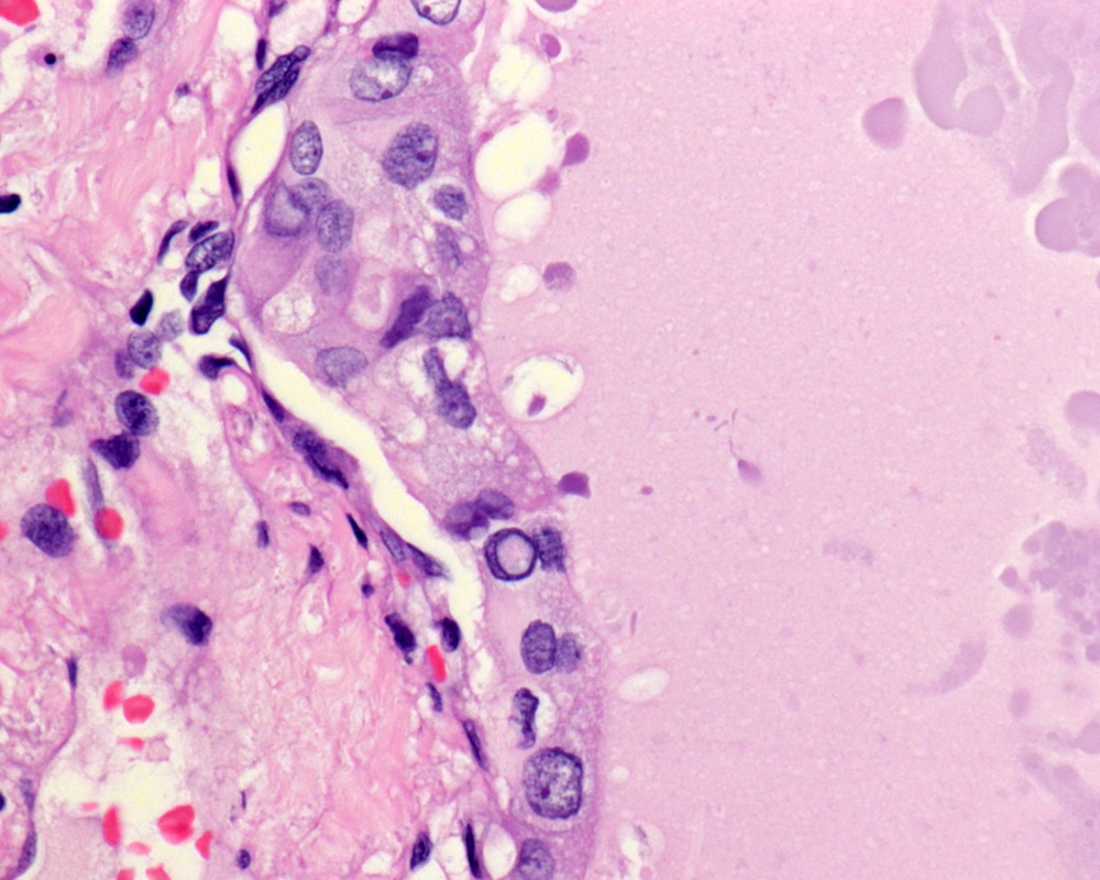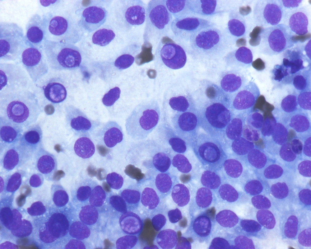 The cells lining the macrofollicles have nuclear features of characteristic PTC including enlarged ground glass clear nuclei, with intranuclear pseudoinclusions and nuclear grooves (Figure 2).
