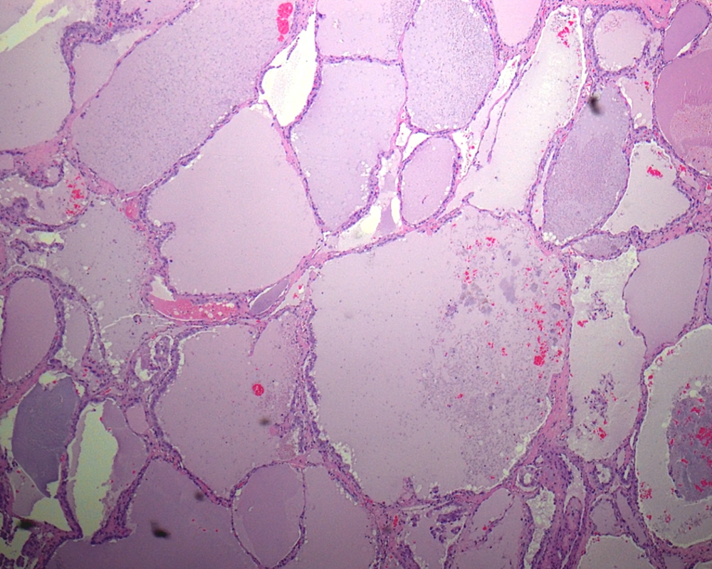 Papillary carcinoma of thyroid (PTC) is the most common malignant thyroid tumor, comprising approximately 80% of all thyroid cancers. PTC has a very broad morphologic spectrum with many histologic variants (Box 1), which their classification is important because patient's outcome in some variants differ from conventional PTC (1). The follicular variant of PTC (FVPTC) is defined by the presence of tumor cells arranged almost entirely in a follicular pattern with the nuclear features identical to that of PTC. The macrofollicular variant of PTC (MFVPTC) is an extremely rare entity, accounting for 0.3% of PTC in Japan (1). It was first described as a distinct entity by Albores-Saavdra et al. in 1991 (2). Histologically, according to the definition given by Albores-Saavdra, MFVPTCs are characterized by the predominance of macrofollicles (follicles >250 μm) (Figure 1), occupying more than 50% of a cross-sectional area (3, 4). In contrary, according to Gamboa-Dominguez et al. (5), the MFVPTC is composed of follicles with a mean diameter of at least 200 μm, surrounded by a thick fibrous capsule that resembles macrofollicular adenoma or nodular goiter.