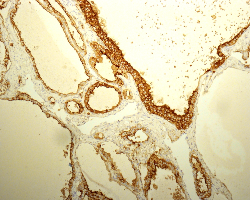 The absence of strict and uniform criteria among expert pathologists, particularly in difficult cases, results in the use of terms such as “multifocal PTC arising in a benign nodule” and “follicular tumor of uncertain malignant potential”. Therefore, there is controversy regarding reporting the cytohistologic condition of these lesions (27, 29-31) and a range of proposals have been made to clarify this issue. LiVolsi and Baloch preferred a scheme in which a diagnosis of MFVPTC would be made on any encapsulated lesion showing any area with the characteristic cytologic features of PTC (32). Chan suggested using stricter criteria including the evaluation of major and minor features. Some immunohistochemical markers, such as high-molecular-weight cytokeratin, cytokeratin 19, vimentin, HBME1 (Figure 5), CD57, CD15, and CD44 have been reported to be more commonly expressed in PTCs than in benign thyroid lesions. These markers are not sufficiently discriminatory to aid in the diagnosis of problematic encapsulated follicular lesions of the thyroid (31).