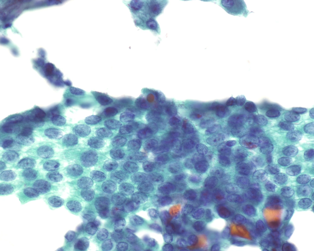 Fine needle aspiration (FNA) is an efficient tool in evaluation of many superficial organs such as lymph nodes (13) as well as deep organs such as the pancreas (14). In contrast to FNA findings of the classical PTC, where this investigation has been shown to have high sensitivity and specificity allowing endocrine surgeons to proceed with total thyroidectomy (15-19), FNA of FVPTC, especially the MFVPTC, is not much helpful in reaching this diagnosis. The macrofollicles contains abundant colloid and some are lined by follicular type of epithelium; hence, the cytologic features are quiet often similar to adenomatous goiter and to macrofollicular adenoma (20-24). For discriminating MFVPTC from these entities on FNA cytology, we depend on the nuclear features characteristic for PTC, which are typically seen in MFPTC (25).The cellular features of MFVPTC are identical to that of PTC and include clear nuclei, nuclear grooves, and intranuclear pseudoinclusions (26) (Figures 3 and 4). MFVPTC tends to have fewer calcifications and less psammoma body formation in comparison to conventional PTC. In all FVPTCs, including the macrofollicular variant, a significant inter-observer and intra-observer variations have been noted even among experts, with major inter-observer disagreements reported in up to 40% of cases (27). A general consensus exists as to the most important diagnostic features, which include nuclear clearing, nuclear grooves, nuclear overlapping and crowding, nuclear membrane irregularity, and nuclear enlargement. Discrepancies arise due to the lack of agreement on the minimal necessary criteria for a definite diagnosis of MFVPTC. Factors that most likely contributed to a false negative diagnosis in some cases included low cellularity, predominance of macrofollicular pattern, presence of macrophages, paucity or absence of nuclear pseudoinclusions and/or nuclear grooves, and presence of moderate to abundant thin watery colloid. Sampling was probably one of the causes for the false negative diagnosis since the nuclear changes suggestive of papillary carcinoma, while undoubtedly present in the histologic sections, were often focal in nature. Unfortunately, the presence of few grooves is not particularly helpful in making the correct diagnosis as it can be focally seen in a variety of lesions including goiter and Hurthle cell lesions. Nuclear overlap, small peripheral nucleoli in atypical follicular cells with grooves, and presence of focal abnormal dense colloid in a background of watery and thin colloid were the most common features in the FNA of MFPTC (26, 28).