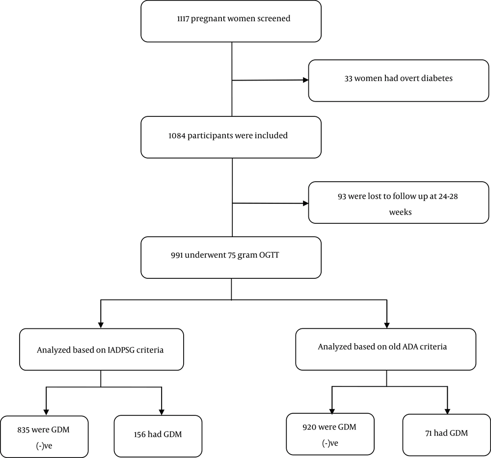 moreover, 39 (2.95%) women had overt DM in their first prenatal visits. Of 1084 pregnant women who did not have overt diabetes at first visit, 93 did not return for further evaluation at weeks 24 - 28 of pregnancy and were not followed up. GTT was performed for the remaining 991 participants. Based on the old ADA criteria (having two plasma glucose measurements of above the specified values), 71 had GDM and the calculated prevalence of GDM was 7.1% (Figure 1).