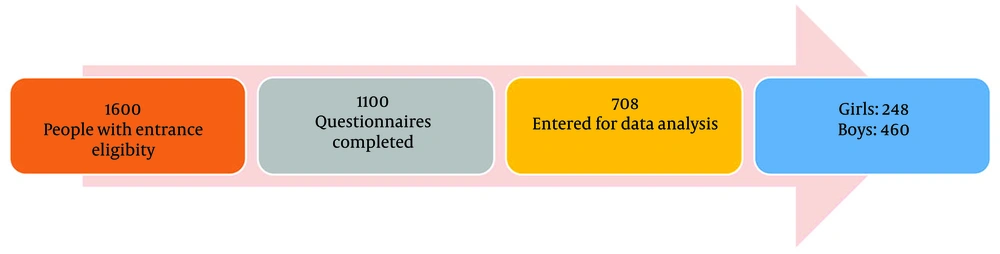 This descriptive cross-sectional study targeted Tehran-based adolescents aged 12 - 18 during the 2023 - 2024 academic year. The Tehran Management and Planning Organization estimated 818,715 students in this age range. Using Cochran’s formula with a 95% confidence level and a 0.05 margin of error, and factoring in a 10% dropout rate (11), the initial target sample was 708 participants. Analyses were performed on both imputed and complete-case data to test robustness. Eligibility included: Ages 12 - 18 years, no intellectual disability or psychiatric disorders, and no history of psychotropic or addictive substance use (self-reported). Exclusion criteria encompassed diagnosed neurological or mental health conditions, current psychotropic medication, or recent substance use that could confound results. Psychiatric status was self-reported and briefly evaluated by an interviewer, with parental/guardian input when feasible. The final sample comprised 708 adolescents (248 girls and 460 boys) from varied regions of Tehran, with a mean age of 15.59 years (SD = 1.83); boys averaged 15.16 years (SD = 1.27) and girls 12.15 years (SD = 1.78). Data were collected from mid-summer to mid-autumn 2023, over about three months, using structured questionnaires. From 1,600 individuals who accessed the survey links, 1,100 completed the questionnaires; analyses ultimately used 708 participants (460 boys and 248 girls). Ethical approval was granted (IR.USWR.REC.1401.112). Recruitment occurred via Instagram, Telegram, LinkedIn, ResearchGate, WhatsApp, and in-person announcements at Tehran high schools. Participants reviewed inclusion criteria, then completed a demographic form and consent (Figure 1).