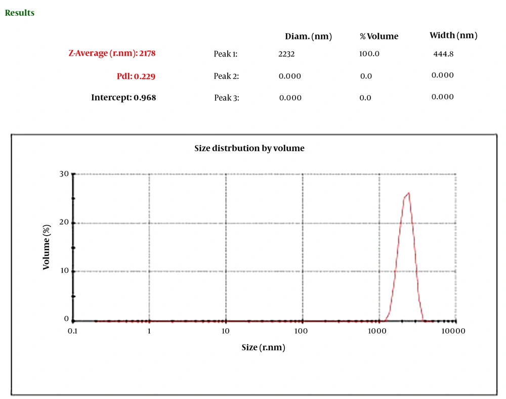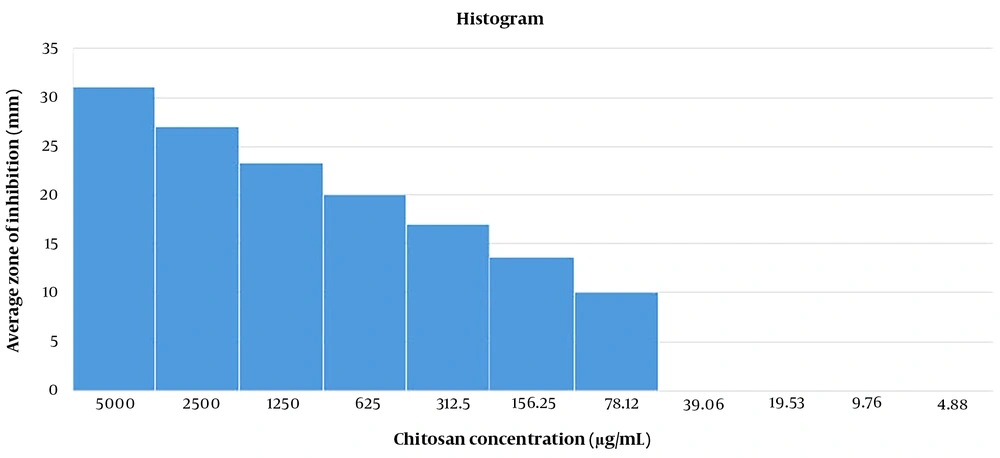 The antimicrobial activity of CNPs was evaluated using the well diffusion method. In this procedure, holes were made in a Müller-Hinton agar medium that had been previously cultured with L. monocytogenes strains. Subsequently, 20 mL of CNPs were added to these wells at various concentrations (range, 4.88 - 5000 μg/mL). The plates were then incubated at 37°C for 24 hours. The inhibition zone diameter was finally measured (9).