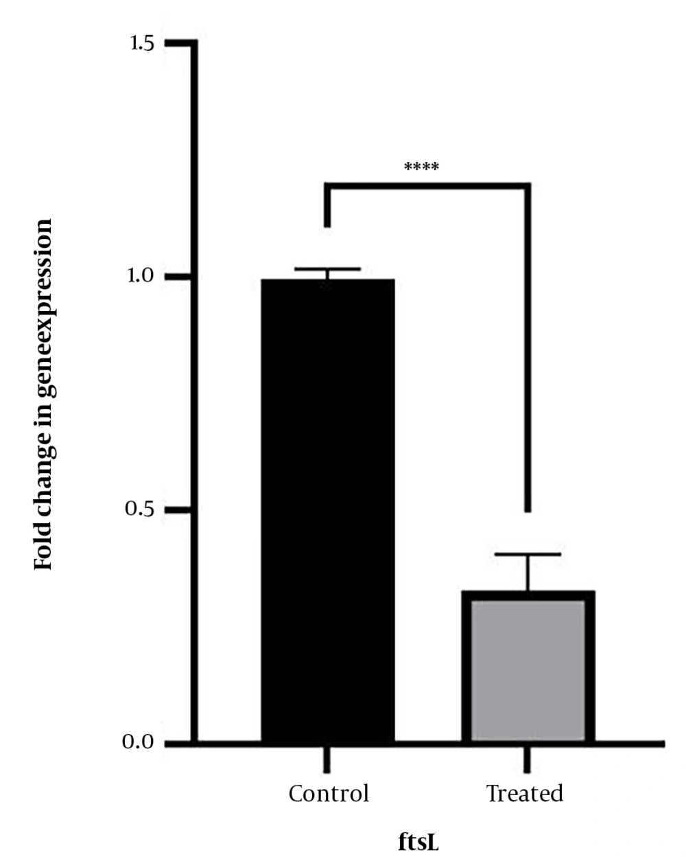 Following the manufacturer's instructions, total RNA was extracted using the Trizol Reagent (Yekta Tajhiz Azma Kit, Iran). According to the manufacturer's instructions, a cDNA synthesis kit (Yekta Tajhiz Azma cDNA Synthesis Kit, Iran) was utilized to convert 5 µg of total RNA into cDNA. The initial amplification of pflA and ftsL was performed using primers. This process began with a 15-minute initial denaturation step at 95°C, followed by a denaturation phase for 15 - 30 seconds at 95°C, primer annealing at 60°C for 30 seconds, and primer extension at 72°C for 30 seconds. After these steps, the samples were stored at 4°C. The RT-PCR assay was performed using a StepOnePlus RT-PCR machine with the Ampliqon SYBR Green Kit (Pishgam Biotech Co., Iran). In three separate studies, reactions were run in triplicate. The RT-PCR findings were analyzed using the -2ΔΔCT technique after the expression data were normalized with LDH to account for any variations in the expression levels (15).