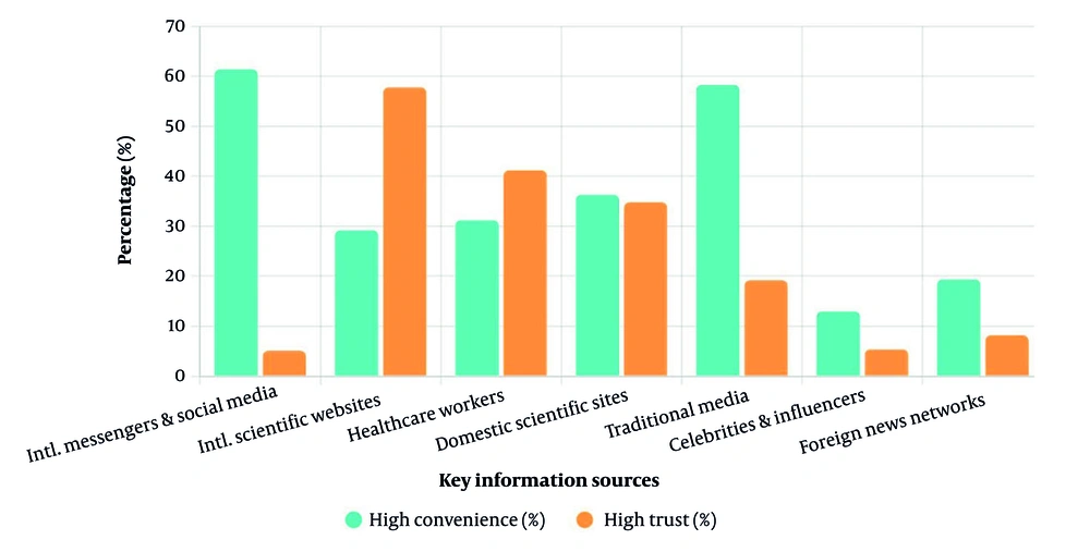 ![Summary of key findings on accessibility vs. trust in COVID-19 information sources: Bars represent percentages of "high" ratings for convenience/accessibility (teal) and trust (orange) from Likert scale responses [data is from <a href="#A157505TBL2">Tables 2</a> and <a href="#A157505TBL5">5</a> (n = 391); multiple responses are allowed; highlights paradox: High convenience (e.g., 61.4% for social media) vs. low trust (5.1%)]. Summary of key findings on accessibility vs. trust in COVID-19 information sources: Bars represent percentages of "high" ratings for convenience/accessibility (teal) and trust (orange) from Likert scale responses [data is from <a href="#A157505TBL2">Tables 2</a> and <a href="#A157505TBL5">5</a> (n = 391); multiple responses are allowed; highlights paradox: High convenience (e.g., 61.4% for social media) vs. low trust (5.1%)].](https://services.brieflands.com/cdn/serve/31710/5487a1afc76583e6e3cf823a9f6ca48d71c12904/iji-12-1-157505-i001-preview.webp)