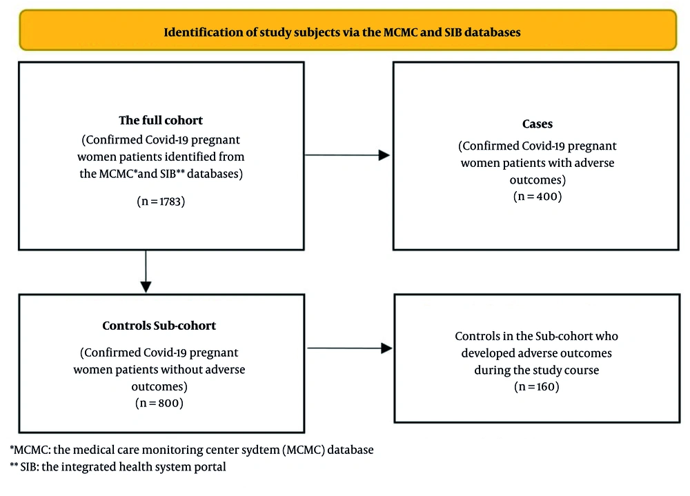 This case-cohort study was conducted between March 2021 and March 2023 in Zahedan, southeast Iran. A case-cohort study classifies participants with a disease as cases and selects controls from the same cohort. This method reduces selection bias and focuses on new cases, helping to clarify associations by examining exposure differences between cases and controls (15). In this study, the full cohort of pregnant women included 1,783 patients who tested positive for COVID-19 using reverse transcription polymerase chain reaction (RT-PCR) tests. From the beginning of the COVID-19 pandemic, Iran’s Ministry of Health set up two web-based databases for registering identified COVID-19 cases in both public and private sectors. Medical Care Monitoring Center (MCMC) database was developed for reporting outpatient and inpatient cases in hospitals, and Integrated Health System (SIB) portal for recording outpatient cases detected by urban and rural health centers (16). This study retrieved data for confirmed COVID-19 cases among pregnant women from the SIB portal and the MCMC database maintained by Zahedan University of Medical Sciences. All data concerning pregnant women diagnosed with COVID-19 were compiled into a unified database for the purposes of this study. Each patient was assigned a distinct identification number. According to the information obtained from the MCMC database, clinical outcomes such as death or hospitalization, along with medical interventions including admission to the intensive care unit (ICU) or the requirement for mechanical ventilation, were classified as patients experiencing adverse outcomes. As presented in Figure 1, a total of 400 confirmed COVID-19 patients with adverse outcomes were identified within the cohort of pregnant women, all of whom were designated as the cases group. Using the SPSS sampling procedure to generate a random sample of patients from the full cohort, a sub-cohort of 800 registered pregnant women who did not experience adverse outcomes at baseline was randomly selected to serve as the control group. From the selected control group, 160 subjects subsequently developed adverse outcomes during the course of the study. No matching was conducted between the cases and controls.
