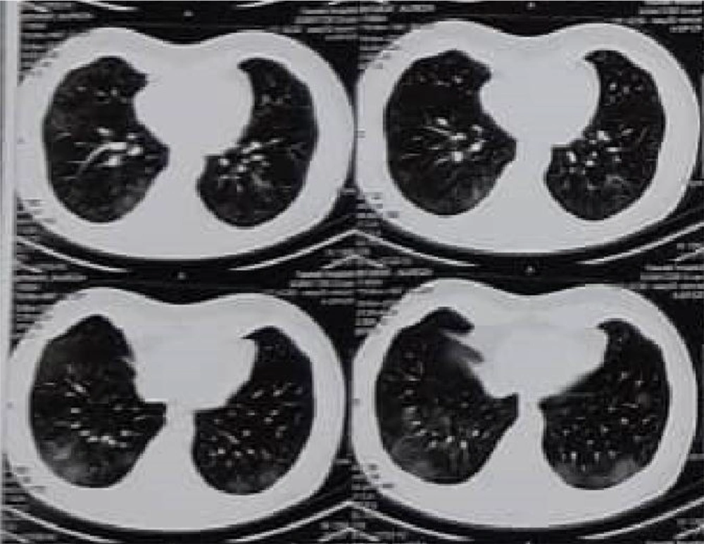 An 18-year-old boy with a history of kidney transplantation for five years due to a neurogenic bladder was admitted to our pediatric nephrology clinic. He had a fever, cough, mild diarrhea, and severe anorexia for two weeks. At the time of admission, he had respiratory distress. SPO2 was 82% on room air, which increased to 95% with supplemental oxygen using a face mask. Physical examination showed tenderness at the transplanted kidney site, conjunctivitis in both eyes, mild dehydration, and crackles in the right lower lung. Urine output decreased to 0.4cc/kg/hour. In primary lab tests, WBC was 2.5 × 103/mm3, with 30% lymphocyte, HB 9 mg/dL, platelets 140 × 103/mm3, Cr 5 mg/dL, and (pre-infection serum creatinine was 2.5 mg/dL). Nasopharyngeal PCR was positive for SARS-CoV2. At the time of admission, while Chest X-Ray (CXR) had no specific findings in the patient, the chest computed tomography (CT) scan (Figure 1) showed the pattern of COVID-19 pneumonia in the form of ground-glass opacities in both lungs. He was admitted to our nephrology ward. Initially, ceftriaxone was initiated for the patient. However, on the third day, due to deterioration of the patient's respiratory status and general condition, he was transferred to the intensive care unit (ICU) for cardiopulmonary monitoring and hemodialysis, and broad-spectrum antibiotics were prescribed and continued throughout the patient's hospitalization despite all the negative cultures in terms of the virus, bacteria, and fungi. Lopinavir-ritonavir was then initiated. MMF and cyclosporine were stopped, and corticosteroid increased and changed to a stress dosage. Since acute febrile illness causes minor stress, 30 - 50 mg/m2/day of hydrocortisone (this amount increased 3 - 5 times in case prednisolone was used) was given to the patient until the fever stopped, and then, the drug was tapered and returned to the patient's previous consumption (14). The respiratory condition was improved after one week, and the patient was transferred to the ward. However, the graft was lost and he underwent dialysis.