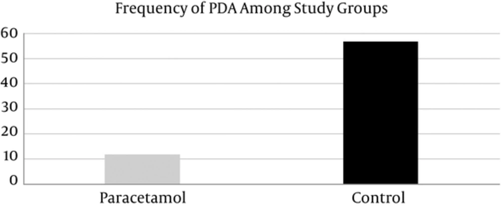 Indomethacin and Ibuprofen are the drugs of choice to close PDA with success rate of 70% - 80% except for the conditions such as renal failure, oliguria, distinct thrombocytopenia, active bleeding, necrotizing enterocolitis (NEC) and bowel perforation (2). Failing the drugs or presence of any contraindication, patients would be candidates for surgical closure. Once paracetamol is widely used as a pain controller for neonates, many experiments are ensuing from. Thus it attracts attentions if be otherwise effective for PDA closure with less adverse effects (3, 4).