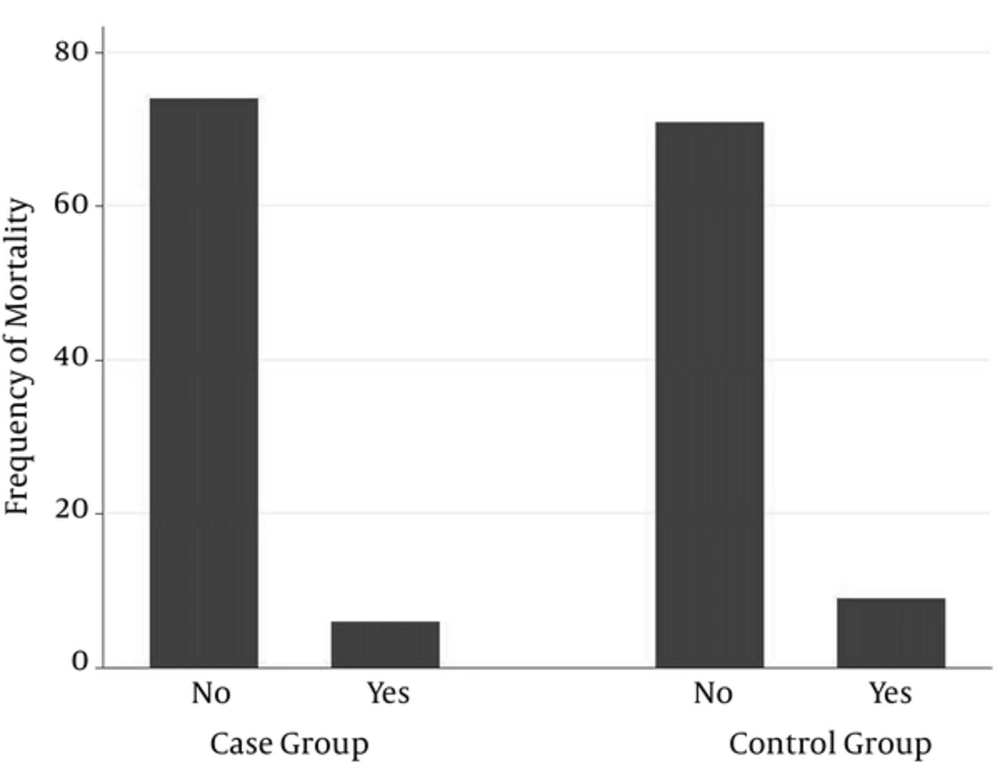 PDA frequency in case group was less than that in control group (12 (15%) vs. 57 (71.25%)). This difference was statistically significant (P < 0.001) (Table 1, Figure 1) whereas none of the following differences was significant, Mean ventilator time needed was 1.66 ± 3.22 days in case group and 2.28 ± 3.85 days in control group (P = 0.14) (Table 1). Means cardiac fraction shortened was 51.39 ± 4.10 in case group vs. 51.27 ± 4.81 in control group. (P = 0.43) (Table 1). 6 (7.5%) neonates died in case and 9 (11.25%) in control group. (P = 0.42) (Table 1, Figure 2). Atrial septal defect (ASD) frequencies of case and control groups were 18 (22.5%) and 25 (31.25%) respectively. (P = 0.21). Ventricular septal defect (VSD) was absent in case group and only one neonate in control group had it. (P = 0.32). Tricuspid valve regurgitation (TR) frequencies in case and control groups were 10 (12.5%) and 14 (17.5%) respectively. (P = 0.38). Mitral valve regurgitation (MR) frequencies in case and control groups were 5 (6.25%) and 3 (5%) respectively (P = 0.47). In addition, no hepatic complications occurred during hospitalization of case neonates.