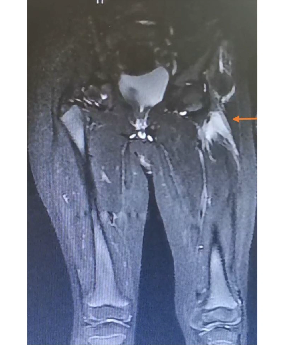The patient’s previous sonography did not report any effusion in the hip or knee, neither did it find a psoas abscess. Repeated sonography showed the same results. Hip magnetic resonance imaging (MRI) found no joint effusion but elucidated signs of inflammation in muscles of the periarticular and proximal femoral area (iliopsoas and gluteus maximus), and no collection could be noticed (Figure 1). By the time MRI was reported, the patient’s pain had worsened, ESR had raised to 90, CRP had decreased to 46, and CPK and LDH were increased to 31 and 466, respectively.