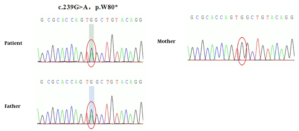 Whole exome and Sanger sequencing revealed novel compound heterozygous mutations in SLC12A3 gene exon regions (Figure 1). One mutation is chr16:56914054. C. 1456G>A (guanine>adenine, missense mutation), which results in amino acid change p.d486n (aspartic acid > asparagine), has been reported as a pathogenic mutation. The patient’s mother was a healthy carrier of this mutation. Another new mutation is chr16:56906668-56906675.c.1065_1072delGGCAGGGG (deletion mutation), which resulted in the early termination of protein translation. This mutation was inherited from the father, who was a healthy carrier. The gene test also showed a heterozygous mutation in the CLCNKB gene (Figure 2). The new mutation is chr1:16373039 c.239G>A (guanine>adenine), resulting in a change in amino acid p.W80* (tryptophan>termination). The patient’s mother was also a healthy carrier of this new mutation.