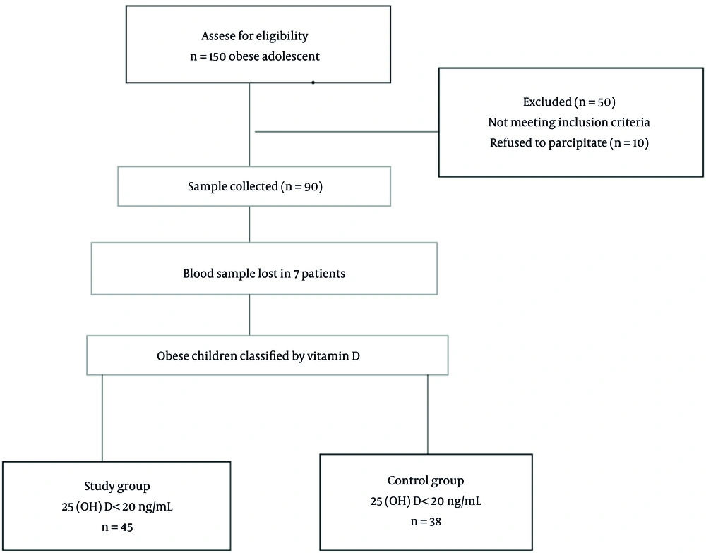 Obese adolescents were evaluated regarding their vitamin D levels. 25 (OH) D level below 20 ng/mL has been accepted as vitamin D deficiency (9). Of the 83 obese patients, 45 with 25(OH)D concentrations below 20 ng/mL were considered the study group, and 38 with 25(OH)D concentrations ≥ 20 ng/mL were considered as the control group.