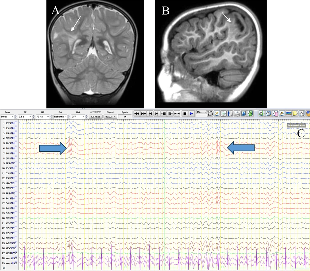 Brain MRI without gad in coronal T2W (A) and sagittal T1W (B) sequences show FCD type IIb with transmantle sign(thin arrow). This trace shows inter-ictal discharges (IEDs) as right-sided (predominantly parietal) polyphasic sharps (thick arrow) predominantly in a referential montage (Pz reference) (C).
