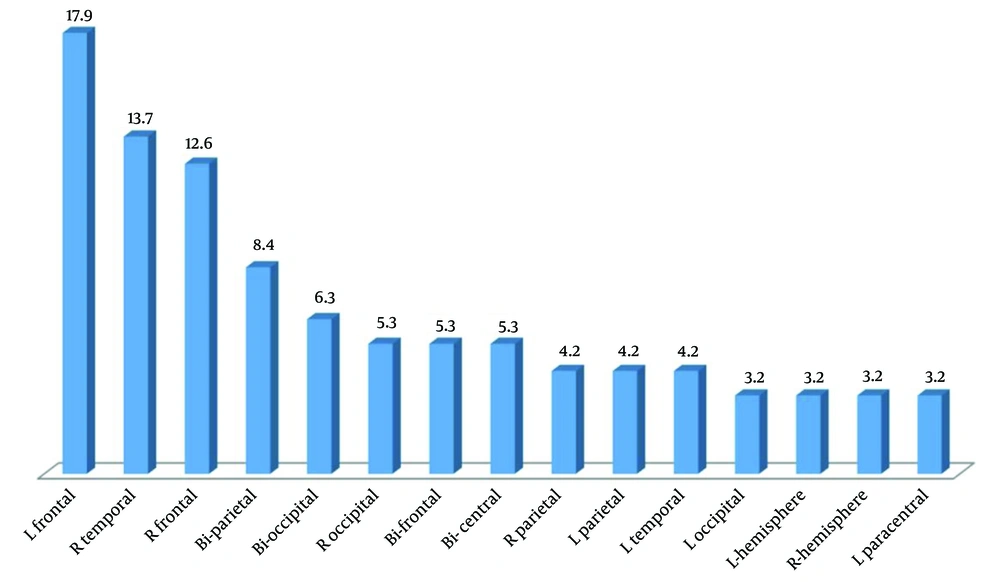 In total, 95 patients with abnormal LTM (53 boys and 42 girls) with an average age of 6.00 ± 3.64 years (ranging from 1 month to 17 years) were included in the study, among whom 59 children (62.1%) had abnormal MRI findings. Baseline characteristics in the two subgroups with and without MRI abnormalities are shown in Table 1. Abnormal neurological examination and prenatal problems were higher in the children with abnormal MRI findings in comparison with those with normal brain MRI (Table 1). As presented in Figure 1, the most common abnormal MRI finding was gliosis (29.3%), followed by focal cortical dysplasia (17.2%) and atrophy (10.3%). Figure 2 shows the most frequent findings in LTM, including left frontal involvement in 17.9%, right temporal involvement in 13.7%, and right frontal involvement in 12.6%. Figure 3 illustrates an instance of consistent abnormality in both LTM and MRI. Out of 95 patients with abnormal LTM, 59 had also abnormal MRI features. In this regard, concomitant right hemisphere involvement in both LTM and MRI was found in 39.0%, concomitant left hemisphere involvement in 28.8%, and involvement of both right and left hemispheres in 18.6% (Table 2). The diagnostic agreement between the MRI and LTM in discovering abnormal findings was found to be high (86.4%) with a kappa correlation coefficient equal to 0.79.