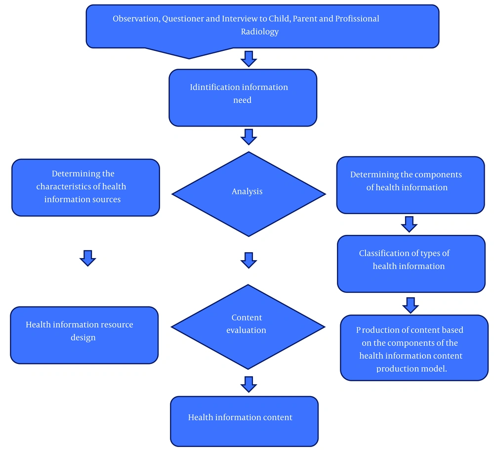 Therefore, it was firstly necessary to develop a model for producing children's health information content for imaging centers in order to investigate the information needs of children from the perspective of children, parents, staff, and doctors of imaging departments, as well as child psychologists.