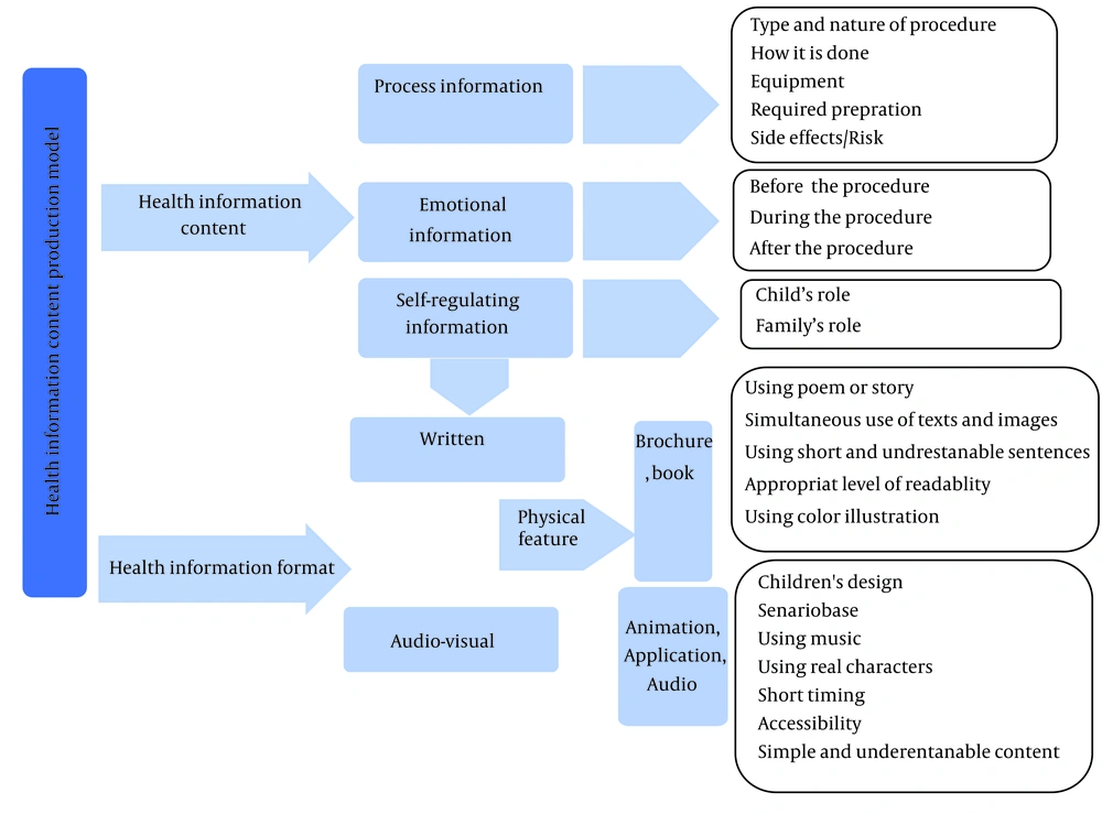 The model extracted from this study can be used to design written and audio-visual educational resources, including films, animations, applications, books, stories, poems, brochures, and pamphlets for children. The study conducted in the radiology department revealed a lack of suitable informational and educational resources for children and their parents. However, the effectiveness of various educational interventions, including the use of informational resources for children and their parents, was confirmed. The results of these studies support the design of a model for producing health information content (31-34).